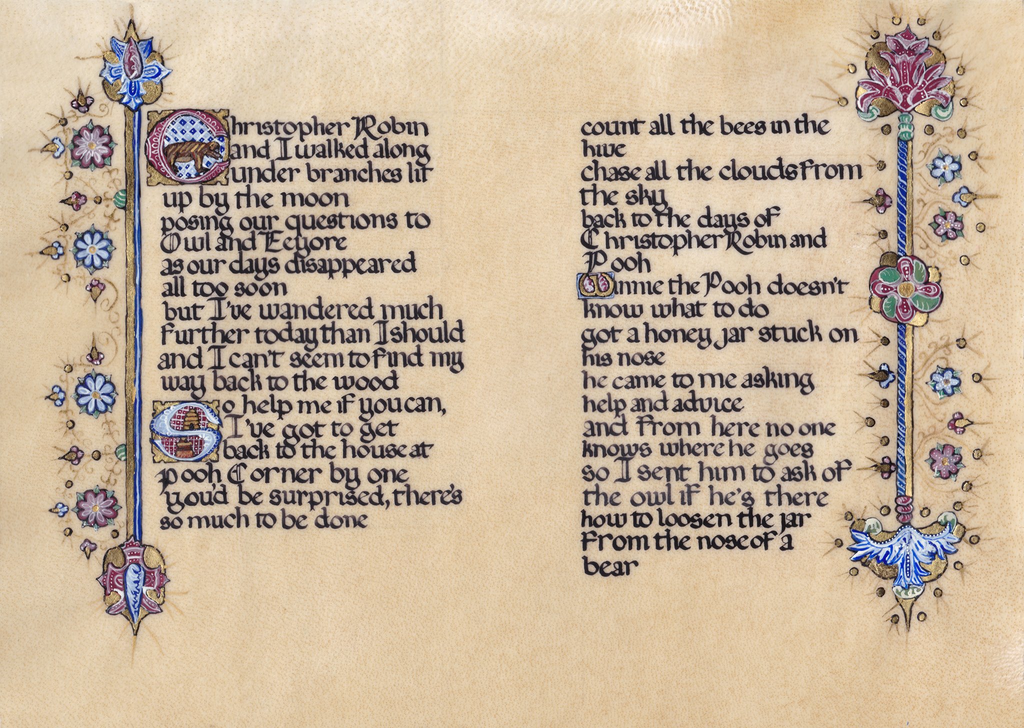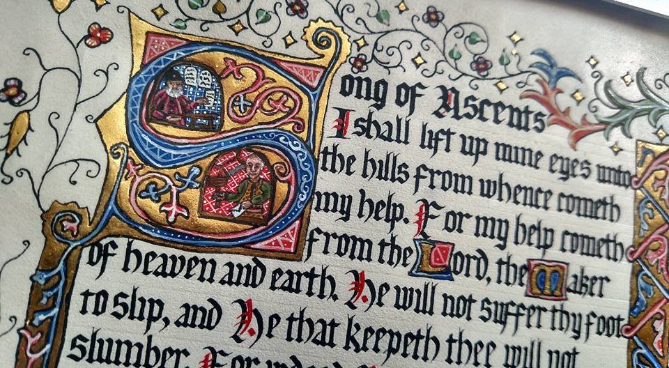 Illuminated manuscripts are named originally for their use of gold leaf, reflecting any light on their surfaces. All of our manuscripts are handwritten with a goose quill using ink made from medieval recipes. All of our paint is made using medieval and renaissance era materials and techniques, and each layer of gold is 23-24 karat gold leaf laid down on period ground or sizing (glue!). They are all on animal skin parchment or vellum and made using historic techniques and materials. The completion of each piece combines the arts of calligraphy and illumination, and sciences of chemistry and experimental archaeology to bring you as authentic a work of art as I can. You will find examples of both single page manuscripts as well as entirely illuminated books below.